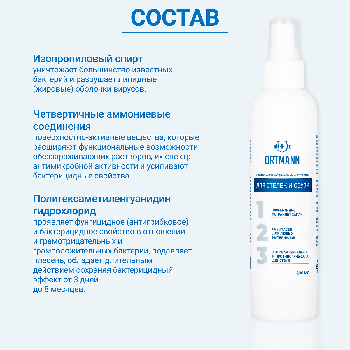 Эффективен в отношение биопленок, образующихся на поверхности стелек и внутри обуви при ее интенсивной эксплуатации. Уничтожает причину неприятного запаха, а не маскирует его. Способствует профилактике грибковых и бактериальных заболеваний стоп.